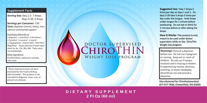 ChiroNutraceutical has specially designed the ChiroThin formula to include specific amounts of amino acids, vitamins, and cell salts for further added benefits. Additionally, the ChiroThin Weight Loss Program includes dietary and behavioral modification guidance, as well as a strategy to help maintain a long-term weight loss.